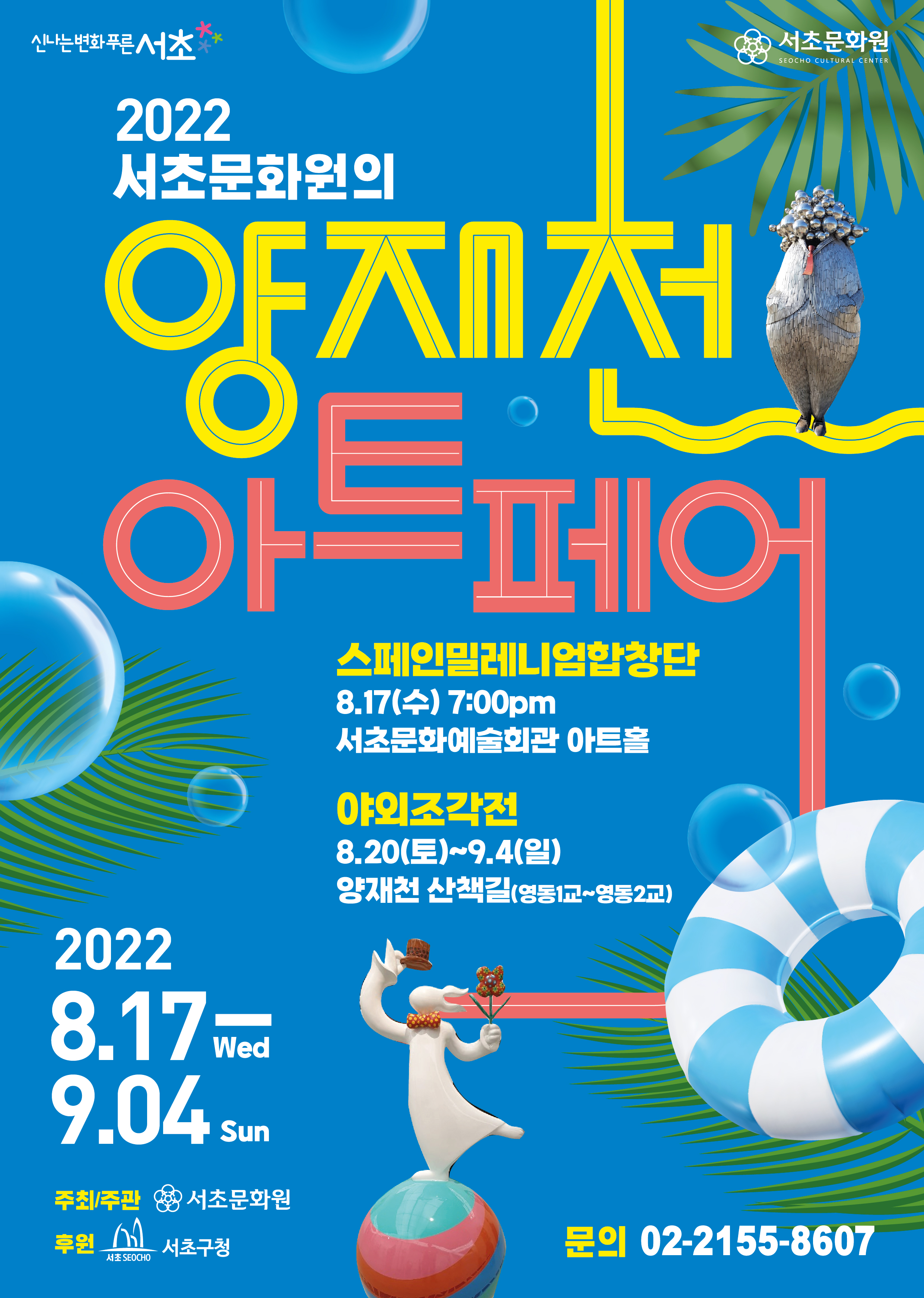양재천 아트페어 페이지 정보 작성자 서초문화원 작성일22-07-26 11:08 조회3,584회 댓글0건 관련링크 이전글 다음글 목록 본문 행사명 양재천 아트페어 일시 2022.08.17.(수) ~ 09.04(일) 장소 양재천 산책길(영동1교~영동2교) 공연정보 개막공연 <스페인밀레니엄합창단 초청 내한 공연> 을 시작으로도심 속 힐링 공간, 양재천에서 2022 양재천 아트페어 – 야외조각전을 개최합니다.자연과 사람 그리고 음악을 주제로 한‘야외조각전’의 작품 감상을 통해일상 속 여유를 즐기시길 바랍니다.*양재천 수해 피해로 인하여 연기 되었습니다. 언론보도 이전글 다음글 목록