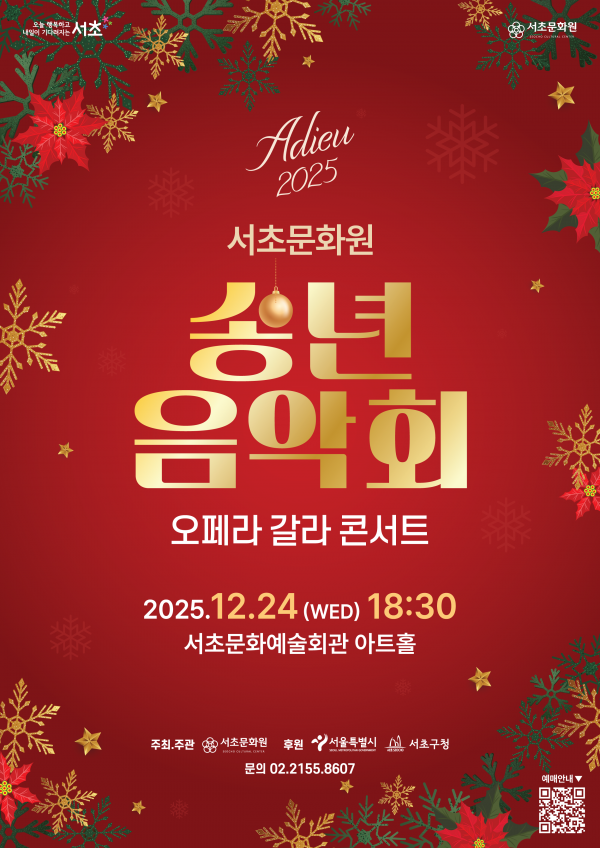 서초문화원 <2025 송년음악회 : 오페라 갈라 콘서트> 페이지 정보 작성자 서초문화원 작성일25-11-25 11:38 조회249회 댓글0건 관련링크 다음글 목록 본문 행사명 서초문화원 <2025 송년음악회 : 오페라 갈라 콘서트> 일시 2025. 12. 24.(수) 18:30 장소 서초문화예술회관 아트홀 공연정보 <제7회 송년음악회> 아름다운 선율의 오페라 갈라와포근한 크리스마스 캐럴,겨울밤을 따뜻한 기쁨으로 물들일 공연! 언론보도 - 다음글 목록