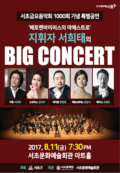 1000회 기념 특별공연 ‘베토벤바이러스의 마에스트로’ 지휘자 서희태의 BIG CONCERT 페이지 정보 작성자 최고관리자 작성일17-12-19 17:29 조회6,066회 댓글0건 관련링크 이전글 목록 본문 행사명 1000회 기념 특별공연 ‘베토벤바이러스의 마에스트로’ 지휘자 서희태의 BIG CONCERT 일시 2017년 8월 11일(금) 19:30 장소 서초문화예술회관 아트홀 공연정보 . 언론보도 서초구민들의 관심과 사랑 속에 서초금요음악회가 1000회를 맞이했다. 1000회 동안 열성 관객이 되어준 서초구민들의 뜨거운 사랑에 보답하고자 1000회 기념 특별공연을 개최하고자 한다. 이전글 목록