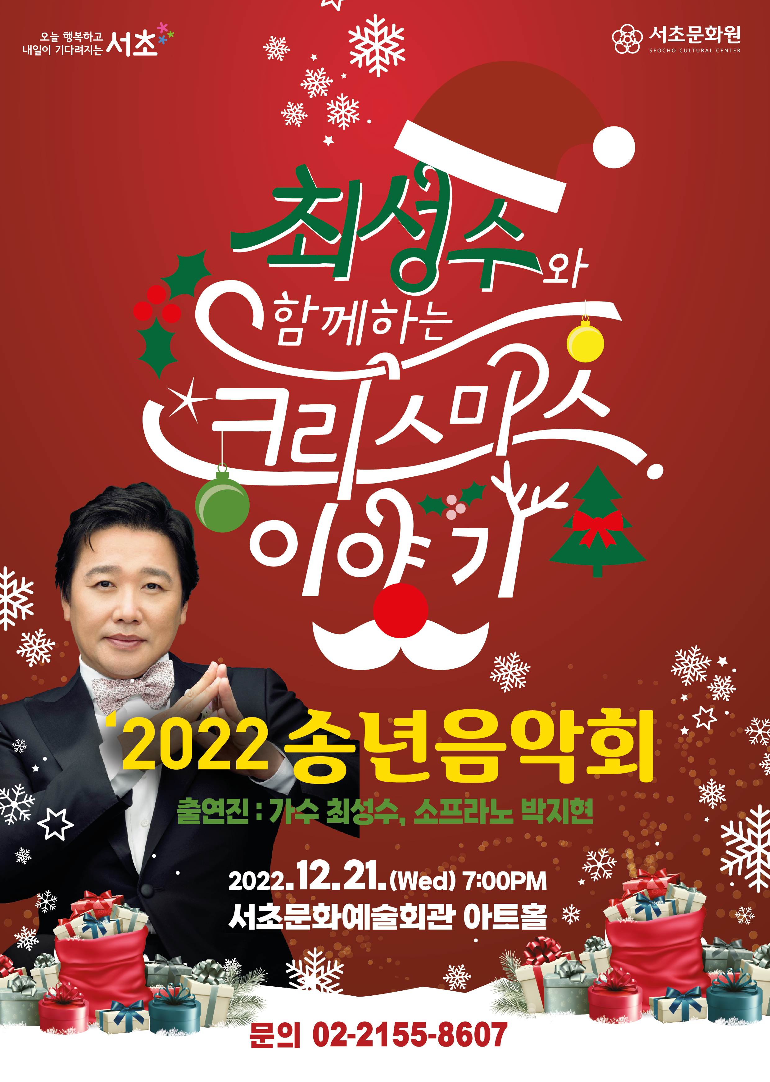 송년음악회 '최성수와 함께하는 크리스마스 이야기' 페이지 정보 작성자 서초문화원 작성일23-02-07 14:56 조회3,230회 댓글0건 관련링크 이전글 다음글 목록 본문 행사명 송년음악회 '최성수와 함께하는 크리스마스 이야기' 일시 2022.12.21.(수) 장소 서초문화예술회관 아트홀 공연정보 <제4회 송년음악회> 언론보도 이전글 다음글 목록