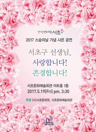2017 스승의날 기념 사은 공연 페이지 정보 작성자 최고관리자 작성일17-12-19 21:27 조회5,793회 댓글0건 관련링크 이전글 다음글 목록 본문 행사명 2017 스승의날 기념 사은 공연 일시 2017년 5월 19일(금) 15:30 장소 서초문화예술회관 아트홀 공연정보 스승의 날에 대한 의미를 되새기고자 기획된 서초문화예술회관 개관 콘서트이다. 언론보도 . 이전글 다음글 목록