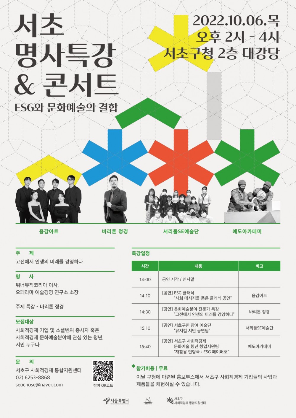 - 행사명 : ESG와 문화예술의 결합! 사회적경제 명사특강 토크 콘서트
