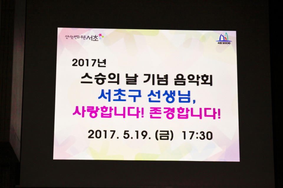 스페셜기념음악회 | 스승의 날 기념 음악회 페이지 정보 작성자 서초문화원 작성일17-10-16 15:19 조회19,120회 댓글0건 관련링크 이전글 다음글 검색 목록 2017년 5월19일 서초문화원 에서 스승의날 기념 음악회가 개최 되었습니다 본문 댓글목록 등록된 댓글이 없습니다. 이전글 다음글 검색 목록
