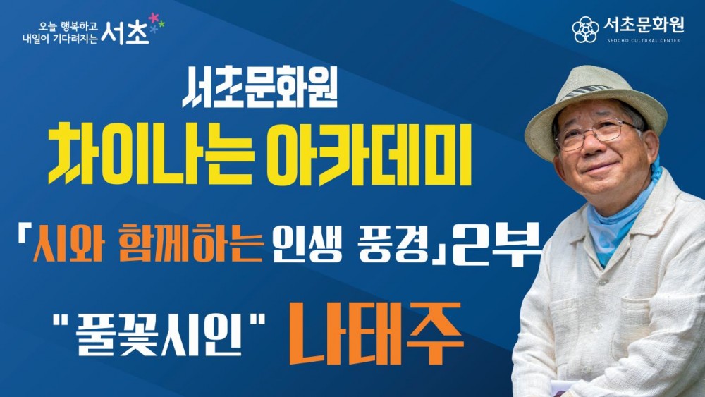 [차이나는 아카데미] '시와 함께하는 인생풍경' 풀꽃시인 나태주 2부 페이지 정보 작성자 서초문화원 작성일24-12-06 15:33 조회2,617회 댓글0건 관련링크 이전글 다음글 목록 본문 서초문화원의 차이나는 아카데미 국민시인 나태주의 '시와 함께하는 인생풍경' 특별 인문학 강연! '서초의 문화를 디자인하다' 서초문화원 댓글목록 등록된 댓글이 없습니다. 이전글 다음글 목록