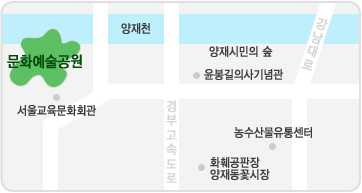 양재시민의 숲 제3구역에 조성된 문화예술공원은 조각공원, 각종 기획전시장, 야외공연장, 만남의 광장등이 공간으로 이루어져 94.5월 완공되어 서초구의 새로운 명소이다. 이곳에서는 지속적인 공연과 전시회등이 열리고 있어 문화자치구를 자랑하는 서초구의 새로운 명소로 각광받고 있다.